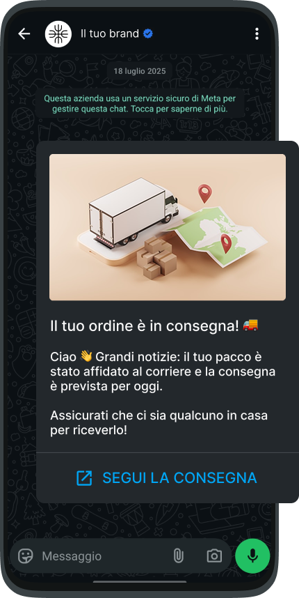 Riduci i ticket di assistenza e l'ansia dell'attesa. Invia notifiche di tracking e info di servizio direttamente nella chat che i tuoi clienti controllano ogni giorno.