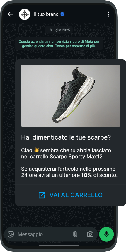 Non lasciare che una distrazione ti costi una vendita. Un reminder discreto su WhatsApp riporta l'utente al checkout esattamente nel momento in cui stava per abbandonare.