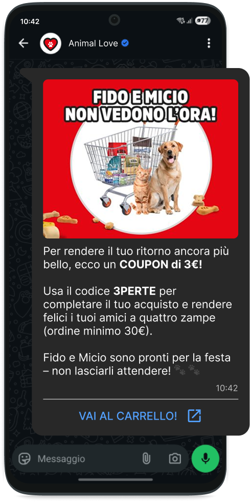 Per intercettare questi potenziali clienti, abbiamo implementato per Animal Love Pet Shop una strategia basata su WhatsApp Business API, mettendo a confronto i risultati con il classico flusso via Email.