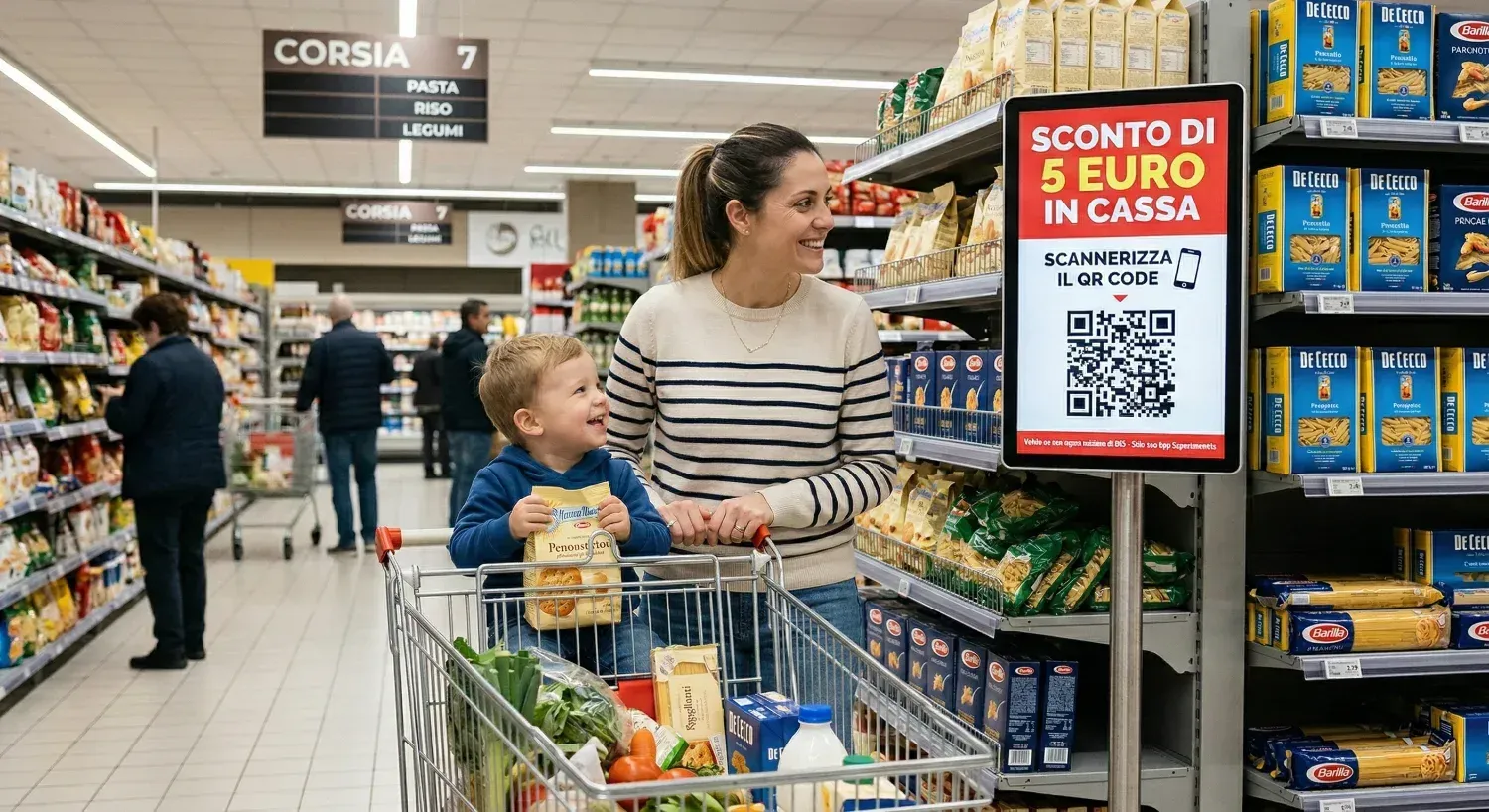 Quando il cliente è nel tuo negozio è nel momento di massima attenzione. Monitor e QR Code strategici lo invitano a scansionare in cambio di un vantaggio immediato "Salta la fila" o "Sconto cassa".