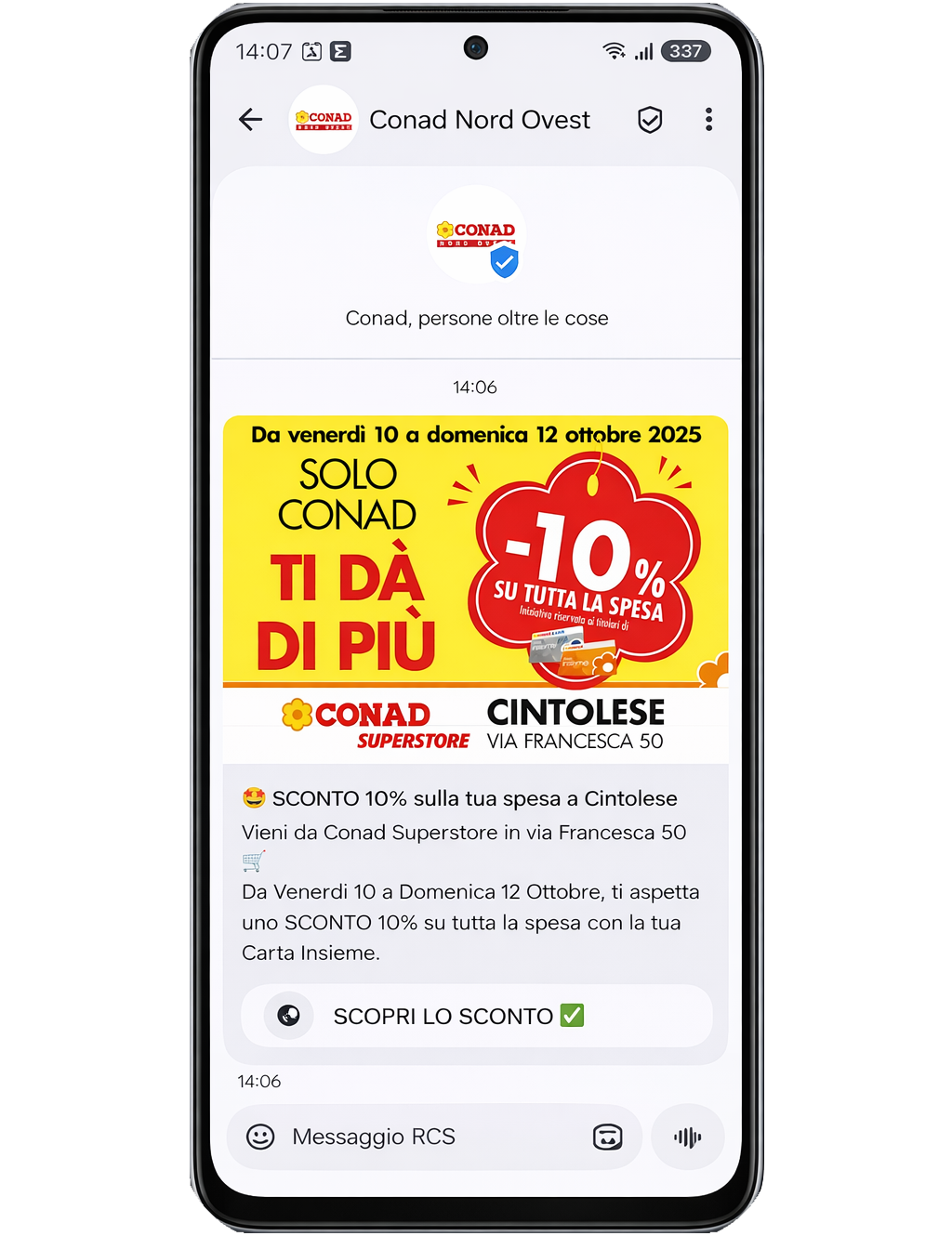 Messaggio con foto, logo e mittente verificato. Nessuna app, nessun opt-in specifico.