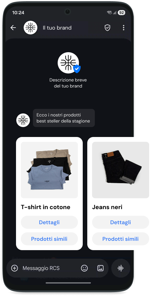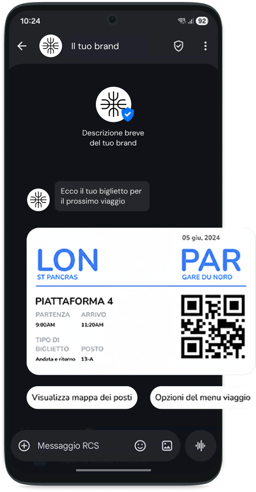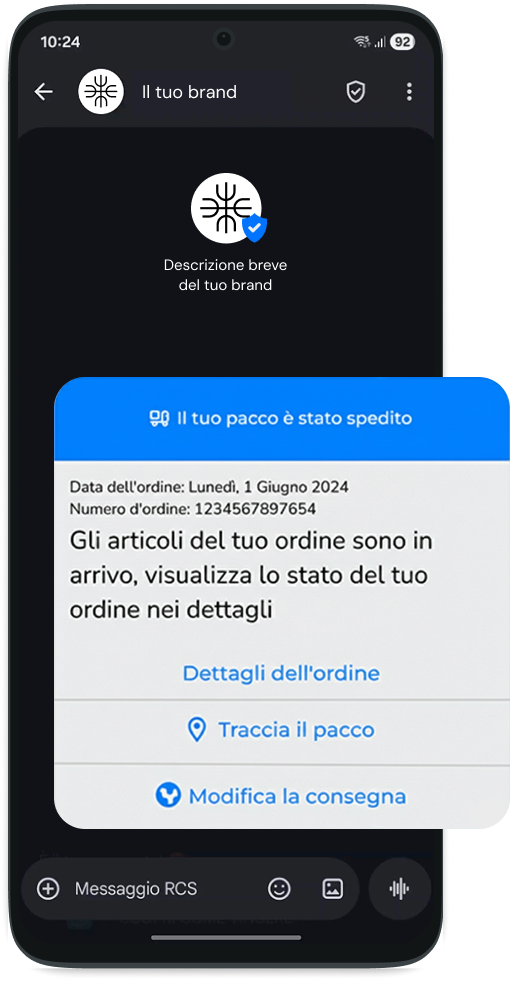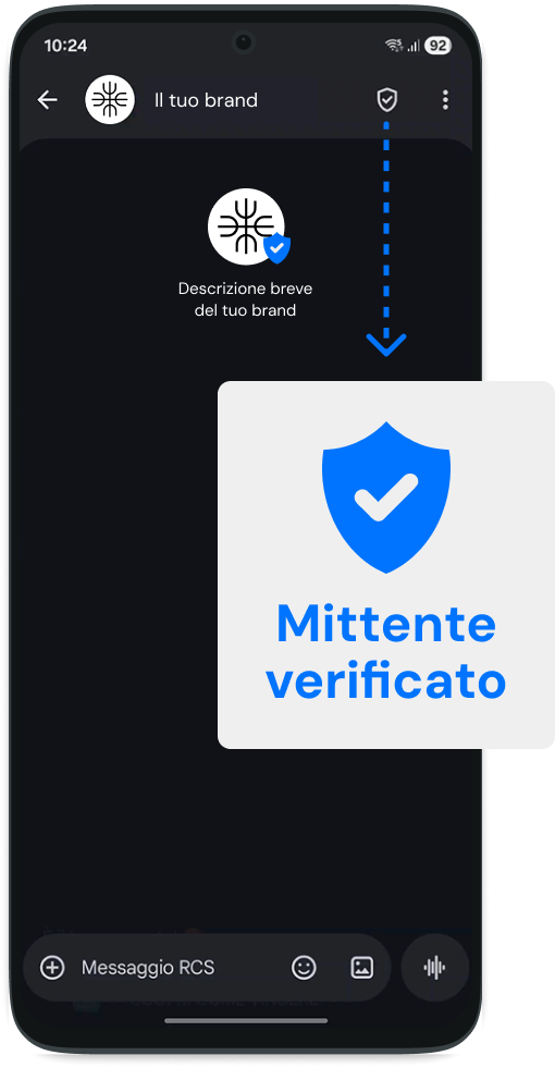 Il sistema RCS combatte le frodi e il phishing. Ogni sender ID deve superare la verifica ufficiale Google. Il destinatario visualizza il Logo Aziendale e la Spunta Blu di certificazione direttamente nell'header della conversazione.