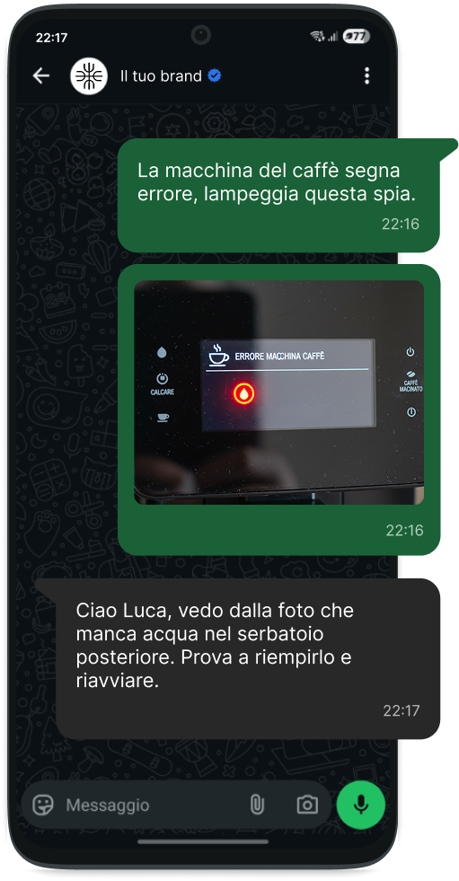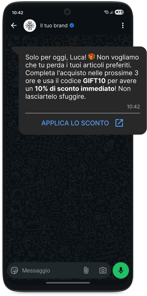 Con WhatsApp Business API costruisci un dialogo reale con i tuoi clienti. Promozioni, aggiornamenti, offerte personalizzate: tutto recapitato nell'app che leggono davvero, con tassi di apertura che l'email non raggiungerà mai.