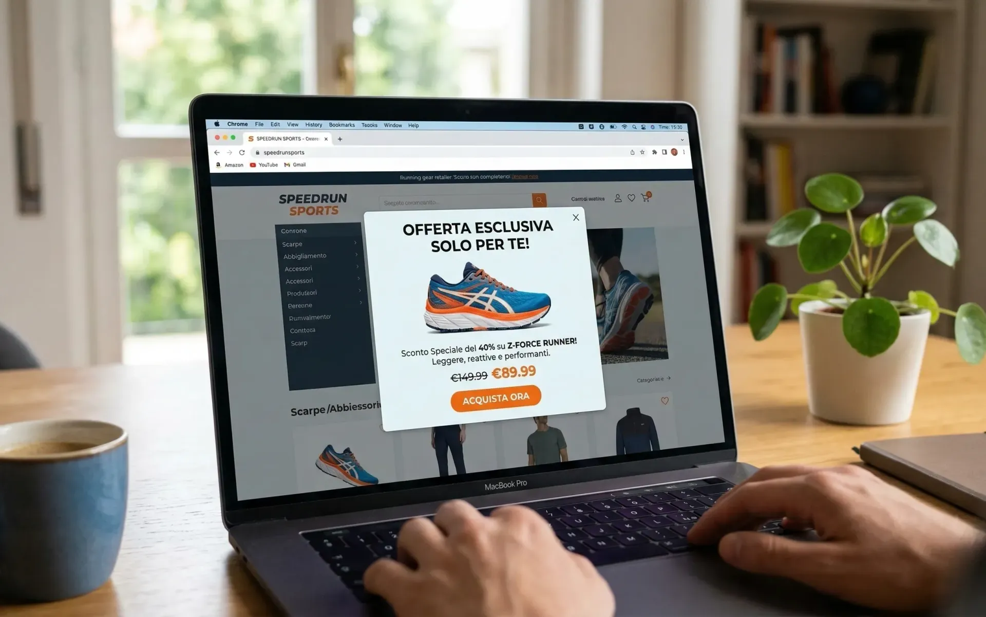 Un utente visita la categoria scarpe da corsa? Gli mostriamo un pop-up su quella categoria. Sta per abbandonare il sito? Attiviamo un'azione prima che se ne vada: uno sconto, un contenuto, una chat. Ogni visita diventa un'opportunità.